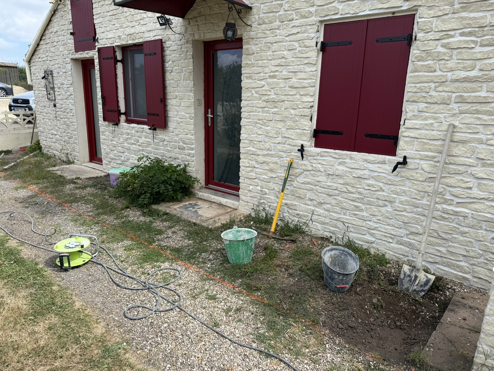 Renovation exterieur creation de trottoir travertin